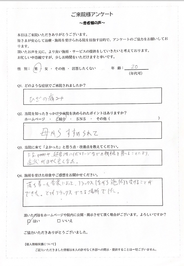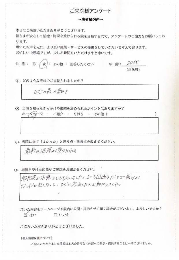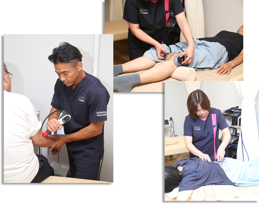 当院では超音波や電気刺激、それらのコンビネーションを使用して、血管拡張効果、筋緊張緩和効果、急性期であれば音圧作用による炎症の抑制など、筋肉、関節、腱、靭帯の損傷部位の治癒を促進し、痛みの緩和、循環機能改善、むくみなどに効果的な治療を行います。